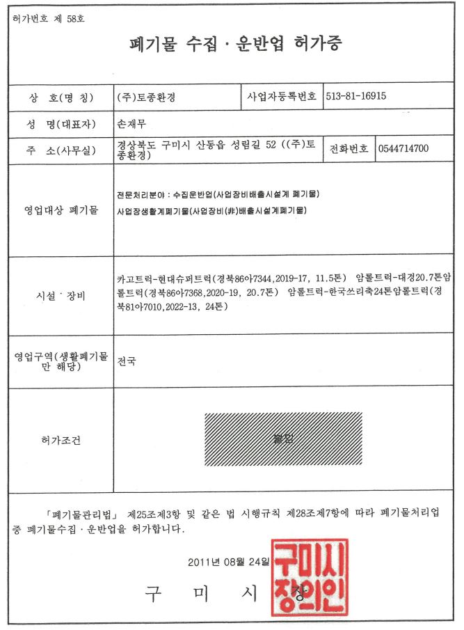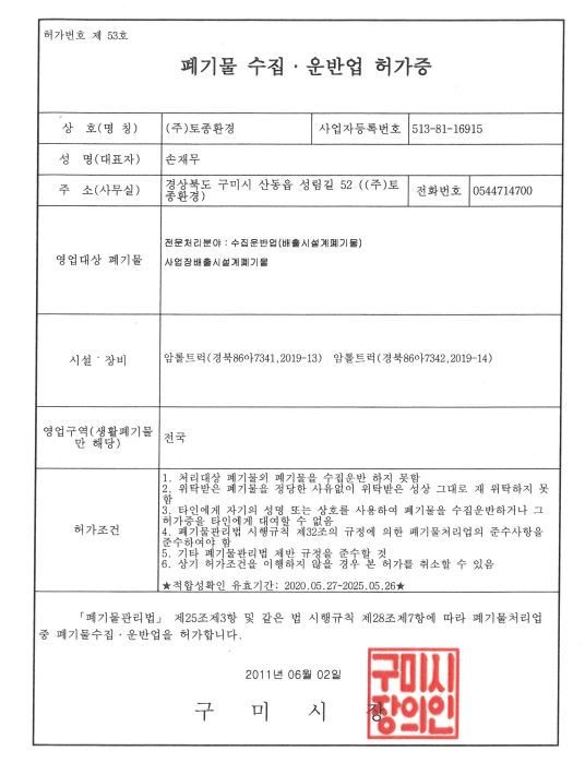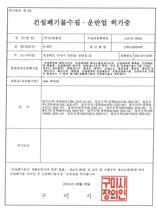 건설폐기물 수집·운반업 허가증