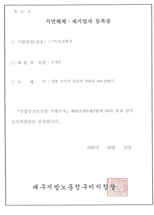 석면해체·제거업자 등록증