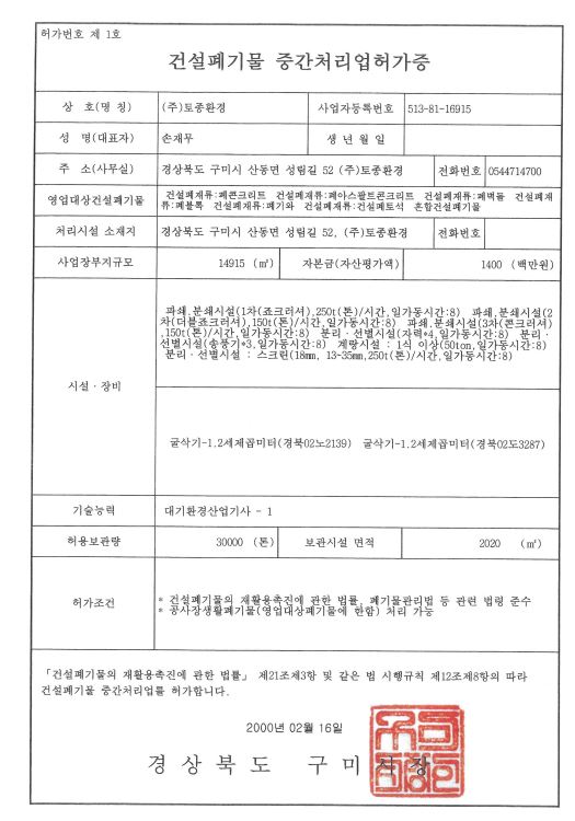 건설폐기물 중간처리업 허가증